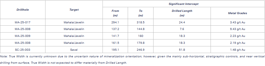 Two drill-holes were completed to test this expansion potential to the east toward the Javelin target and to the north. Drill-hole MA-25-017, collared approximately 200 m east of the known Mahala resource boundary, intersected broad disseminated mineralization of 47.2 m grading 2.75 g/t Au, including two separate high-grade intercepts of 24.4 m at 3.44 g/t Au and 10.7 m at 3.17 g/t Au (see Figure 5 below showing cross-section details). These results indicate that Mahala gold mineralization remains open to the east in the direction of the Javelin target.
