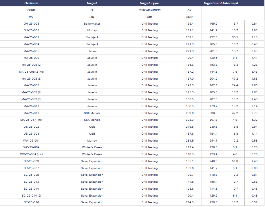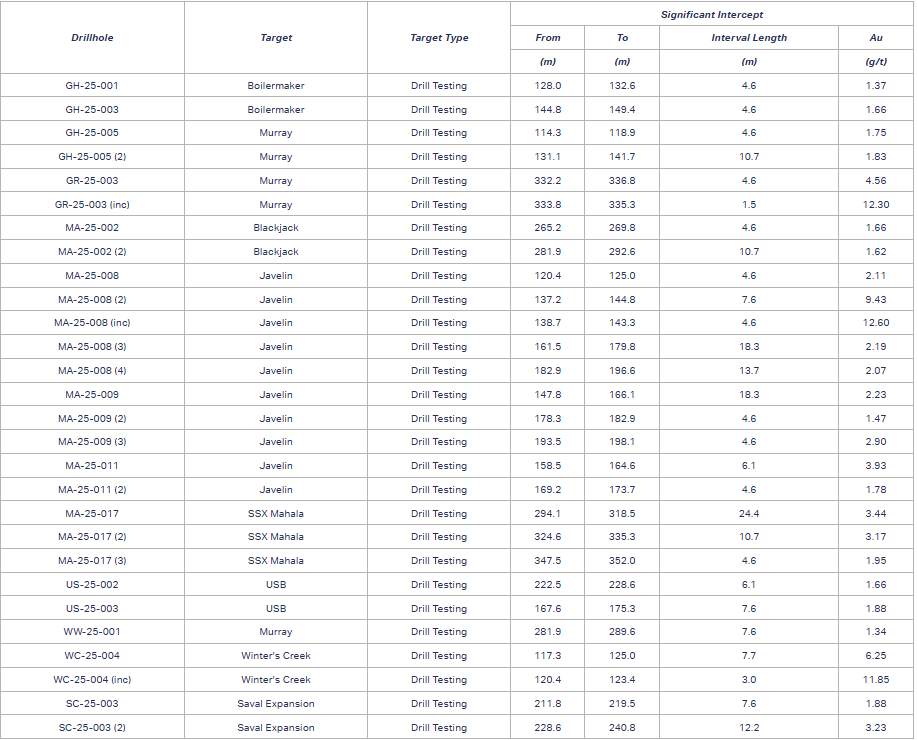 Table 1 presents a selection of drill hole intercepts with significant assay results from the 2025 drill program at Jerritt Canyon, and Figure 1 highlights the areas with significant gold drilling intercepts across the district.