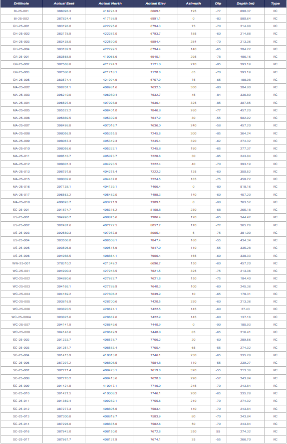 - See Appendix to this news release for details regarding drill hole locations, sample type, azimuth, dip and total depth.