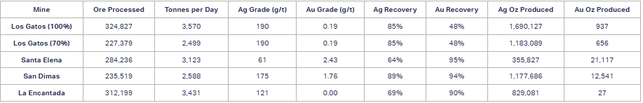 - Santa Elena produced 355,827 ounces of silver, up 5% year-over-year, and 21,117 ounces of gold, down 1% year-over-year.
