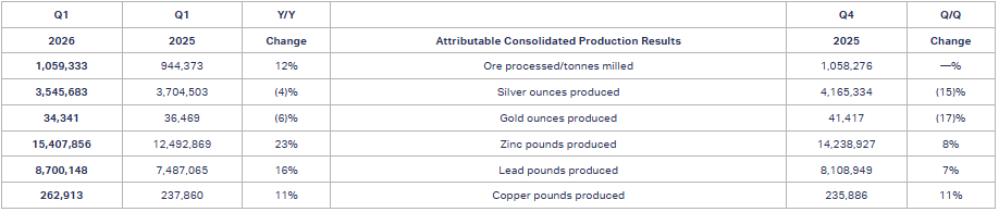 - During the first quarter, Los Gatos produced 1,183,089 ounces of silver, 15,407,856 pounds of zinc, 8,700,148 pounds of lead, 235,886 pounds of copper and 656 ounces of gold, aligned with guidance. The Company continues to focus on increasing throughput at Los Gatos by increasing mine development and long-hole drilling rates and is targeting a sustained ore throughput of 4,000 tpd, based on operating days, in the second half of 2026.