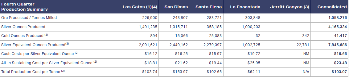 - The Company produced 7.8 million AgEq oz in the fourth quarter (8.9 million using 2025 guidance metal prices), a 37% increase compared to 5.7 million AgEq oz produced in the fourth quarter of 2024. This growth was primarily driven by a 77% increase in attributable consolidated silver production, including contributions from Los Gatos, as well as a 10% production increase at San Dimas.