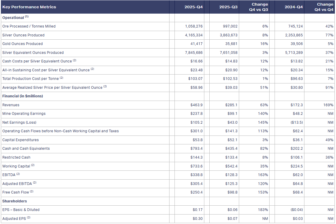 - Record Quarterly Silver Production (+77% Y/Y): The Company achieved record quarterly silver production by producing 4.2 million silver ounces (“oz”) in Q4 2025, a 77% increase when compared to 2.4 million silver ounces produced in Q4 2024.
