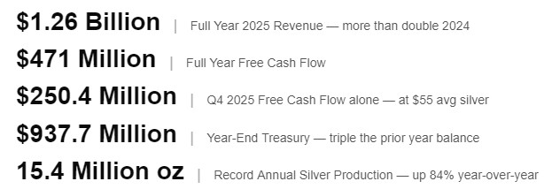 Q4 alone generated $250.4 million in free cash flow when silver averaged $55.5 The Q1 2026 numbers are not yet public. They will reflect silver above $70 for the entire quarter.